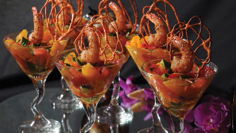 Stir cilantro into vegetables. Evenly divide vegetables among 4 serving plates. Top with reserved citrus segments and 3 prawns each; sprinkle with sesame seeds. Serve immediately. Serves 4 as a first course.